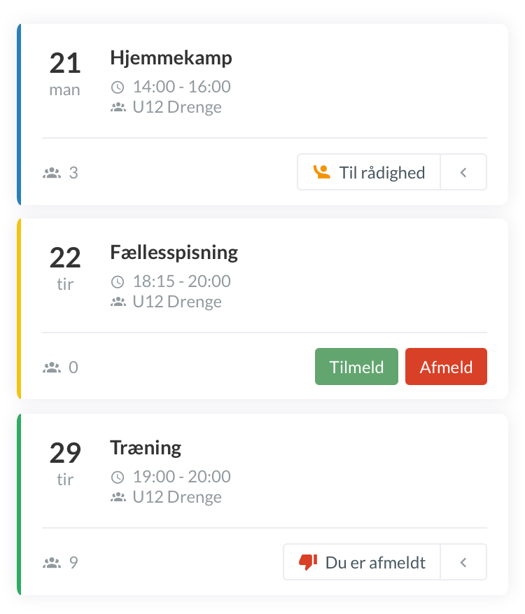 - Nem måde at synliggøre forskellige former for aktiviteter i holdets kalender/på oversigten