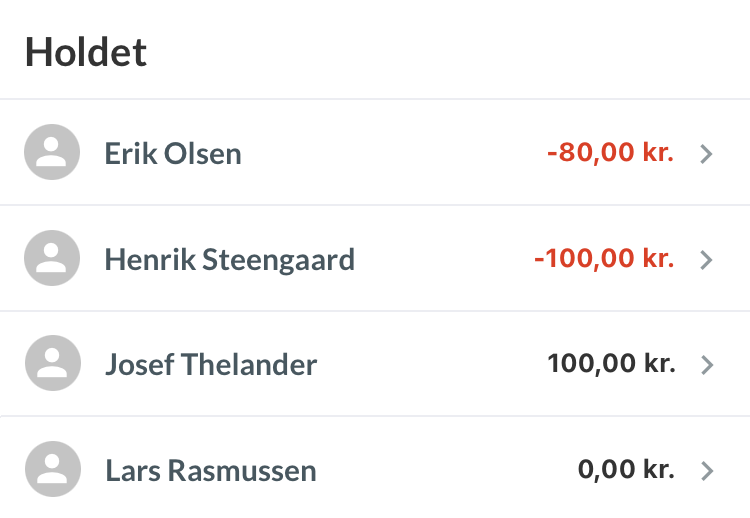 Eksempel: Her ses det at Kamilla har betalt for meget, mens Kasper og Jesper skylder til bødekassen.