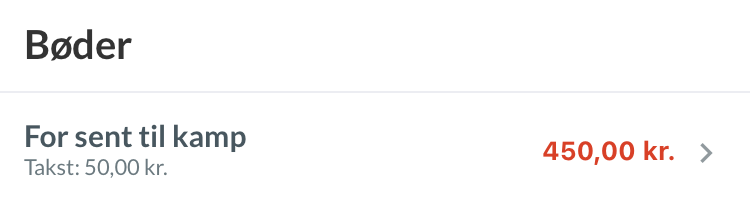 Eksempel: På dette hold findes der bødetypen "For sent til kamp", som koster 50 kr. per bøde. Indtil videre er der tildelt bøder for sammenlagt 450 kr.