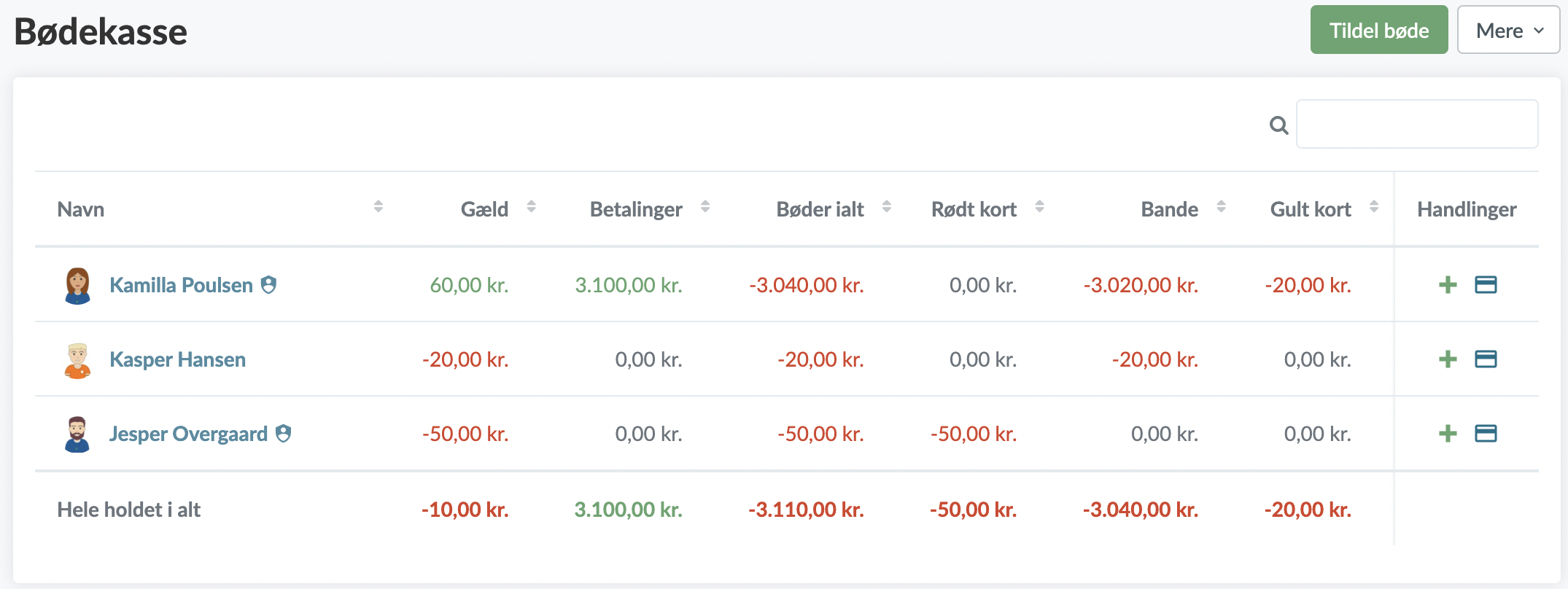 Inde på bødekassen vises det samlede overblik over, hvad medlemmerne skylder. Det vil sige bøder og registrering af betalinger.