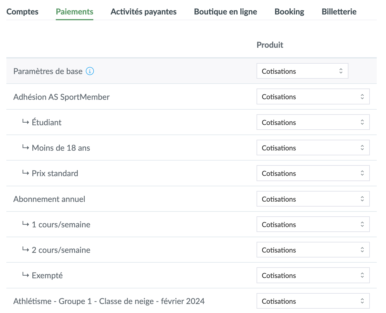 - Puis, aller dans les onglets Cotisations, Activités payantes, Boutique en ligne, Réservations et Billetterie pour lier les produits que vous avez créés précédemment aux paiements correspondants.