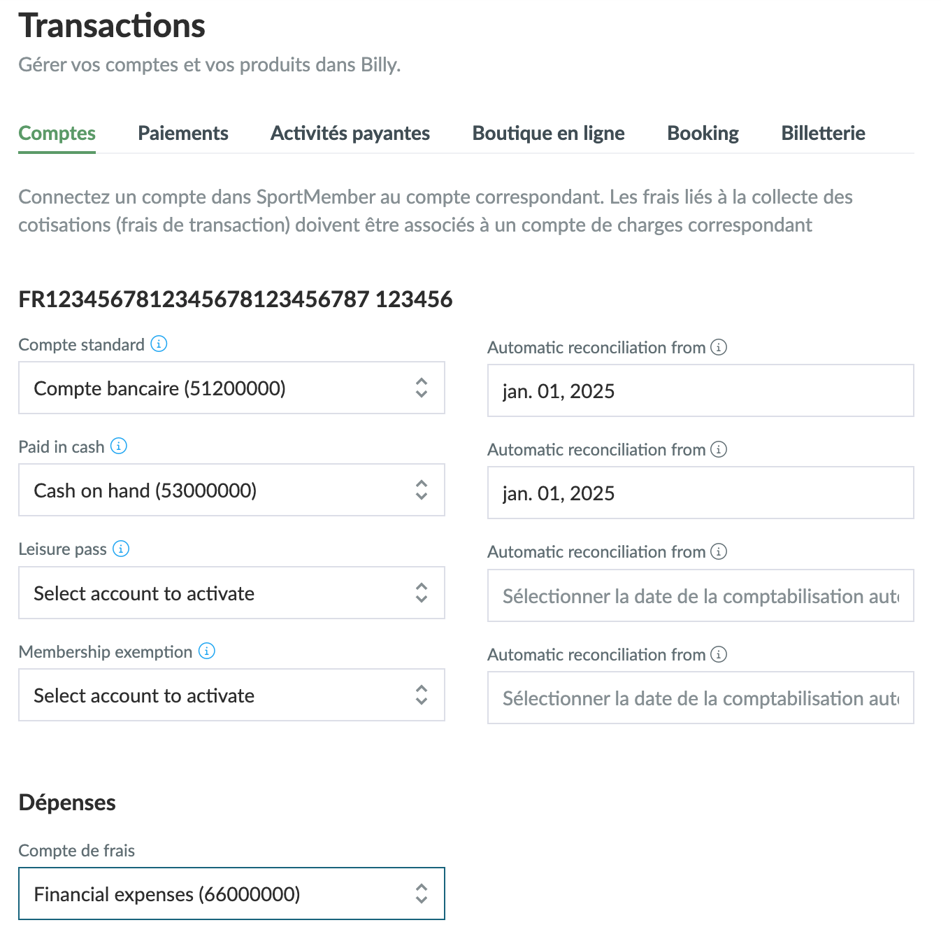 - Ensuite, aller dans l’onglet Comptes pour définir les comptes bancaires avec les comptes de solde correspondants dans le plan comptable.